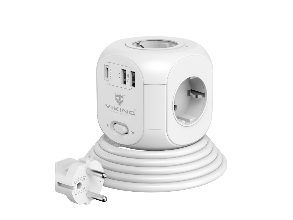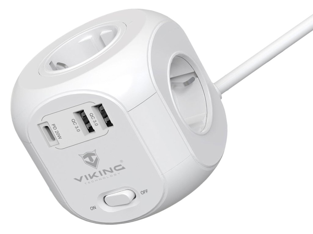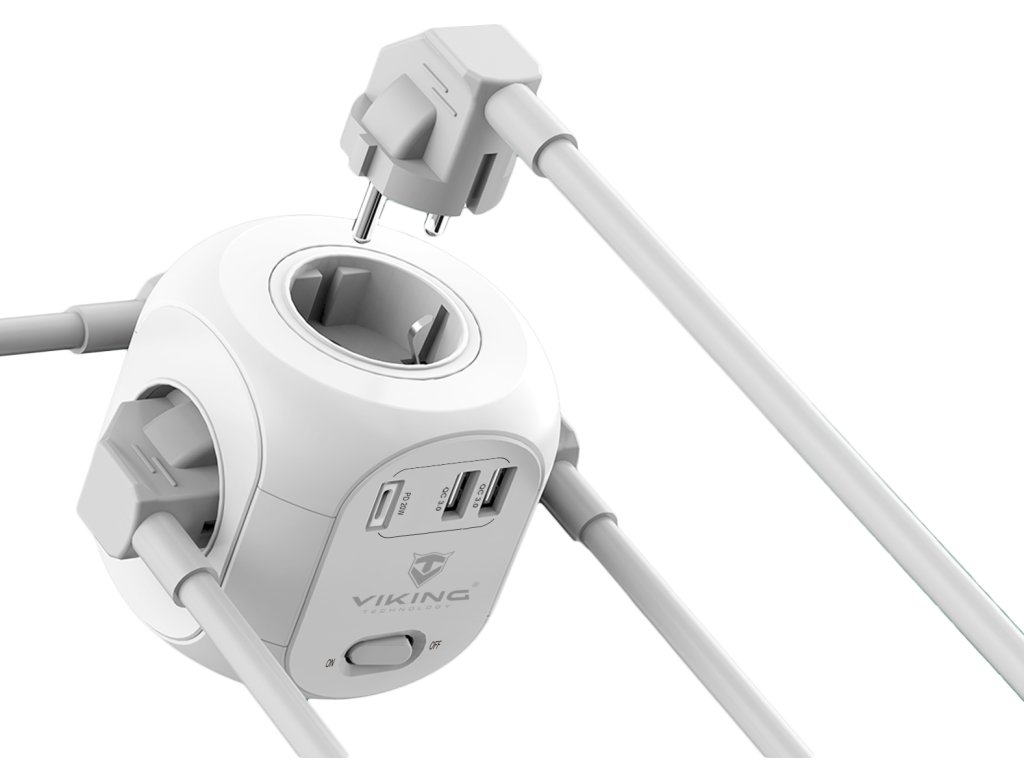Síťový adaptér Viking AC Cube PD je praktickou kombinací čtyř zásuvek, tří USB portů a 1,8 m prodlužovacího kabelu v jednom, který šetří místo a umožňuje napájení až 7 zařízení současně.