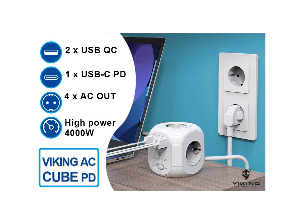 Se čtyřmi AC zásuvkami, dvěma rychlými USB-A porty a jedním výkonným USB-C portem s podporou rychlonabíjení PD a QC umožňuje Viking AC Cube PD napájet současně až sedm zařízení. Už nikdy nebudete muset hledat volnou zásuvku nebo USB port.