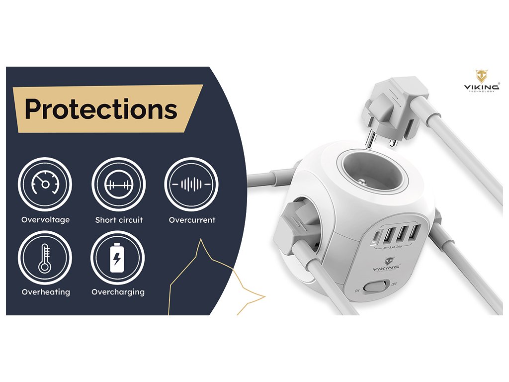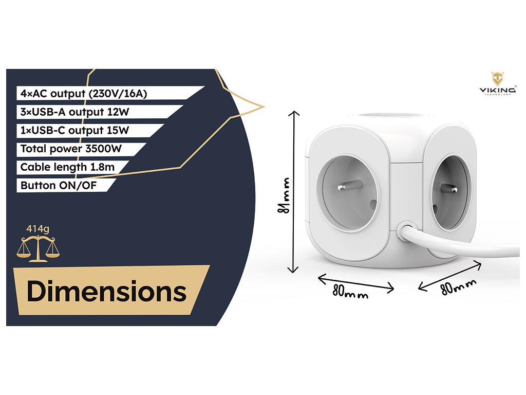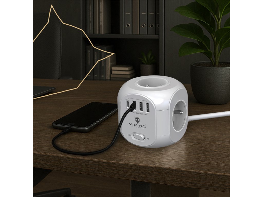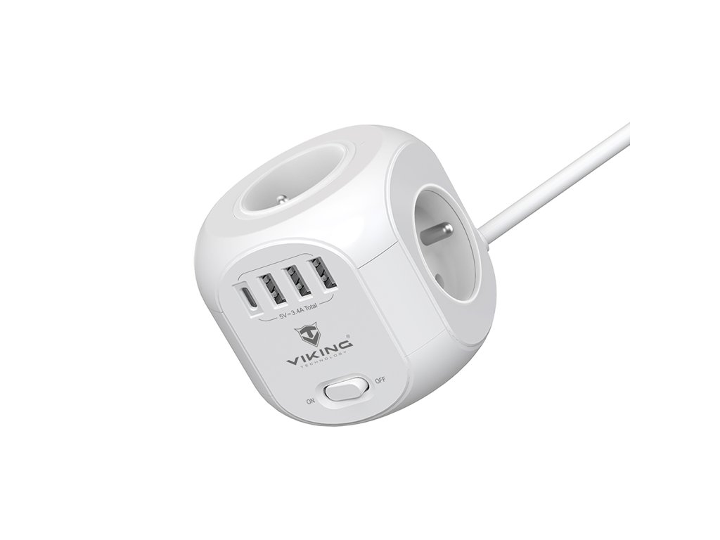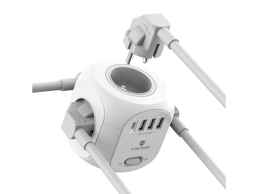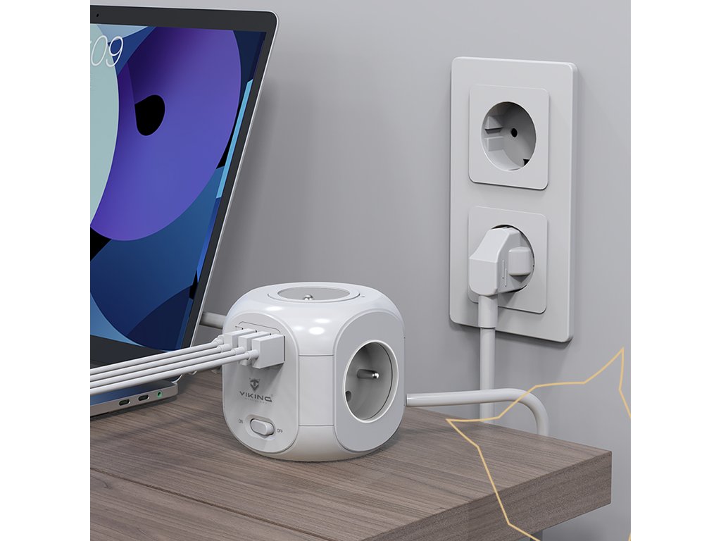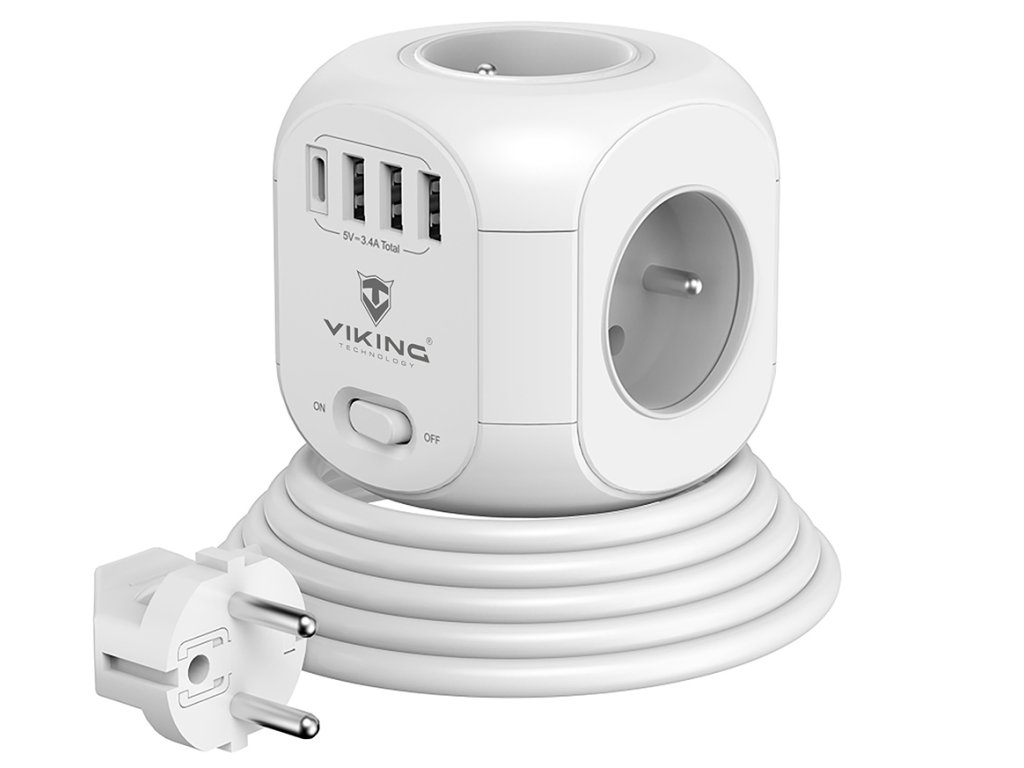 Síťový adaptér Viking AC Cube je praktickou kombinací čtyř zásuvek, čtyř USB portů a 1,8 m prodlužovacího kabelu v jednom, který šetří místo a umožňuje napájení až 8 zařízení současně.