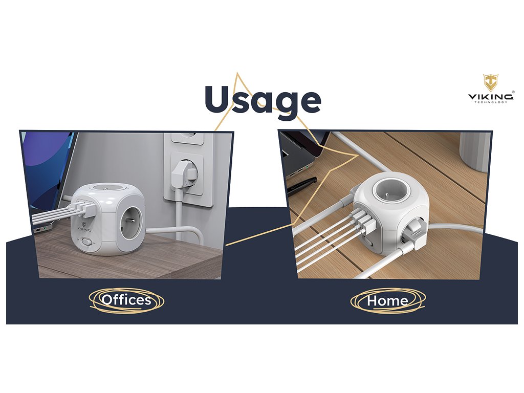 Díky čtyřem AC zásuvkám, třem USB-A portům a jednomu USB-C portu umožňuje Viking AC Cube současné napájení až osmi zařízení. Už nikdy nebudete muset hledat volnou zásuvku nebo USB port.