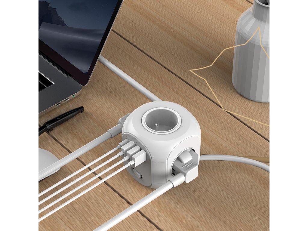 Síťový adaptér • zásuvka • rozbočovač • 4 x AC výstup (230V) • 3 x USB-A výstup 12W (5V/2.4A) • 1 x USB-C výstup 15W (5V/3A) • krychlový design • tlačítko ON/OFF • kompaktní rozměry • délka kabelu 1,8 m • možnost nabíjení až 8 zařízení současně
