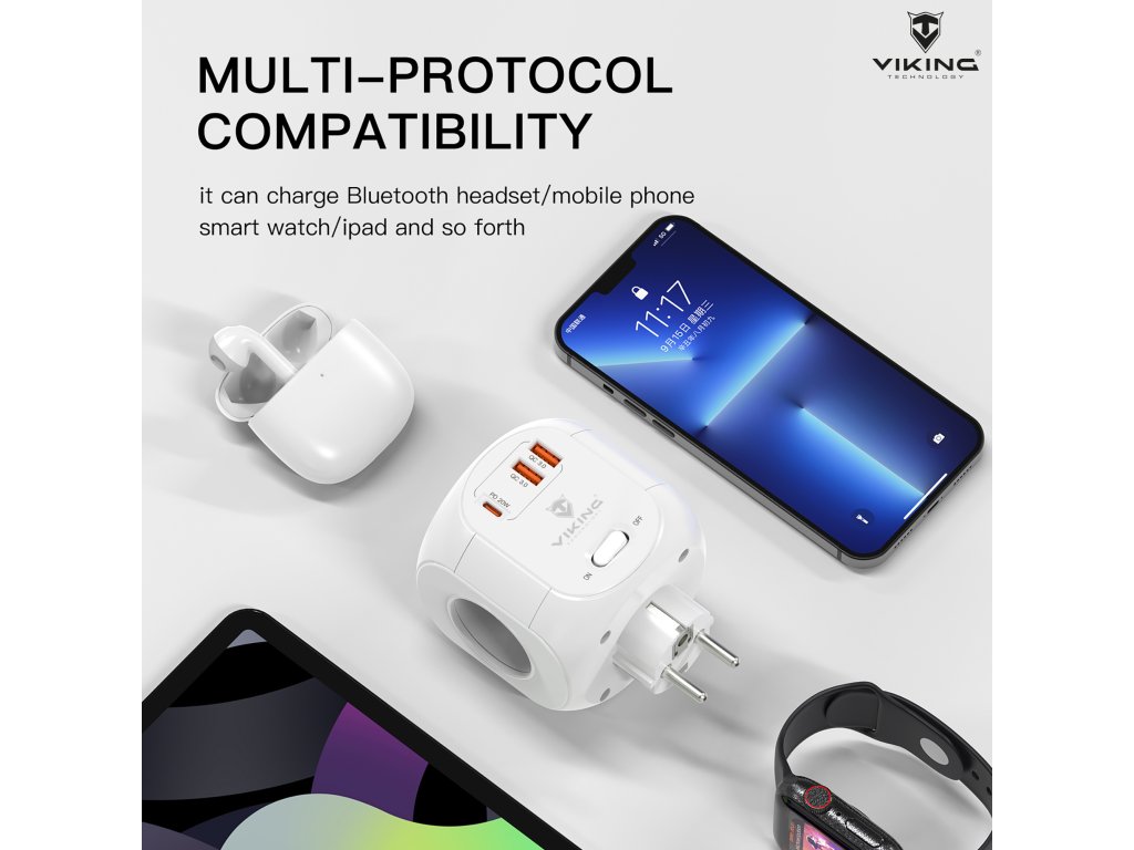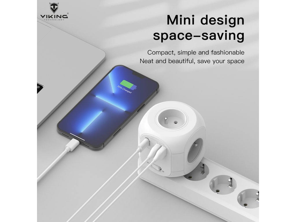 Síťový adaptér Viking AC43 umožňuje nabíjet až 7 zařízení současně a díky své kompaktní velikosti je ideální pro domácí i cestovní použití.