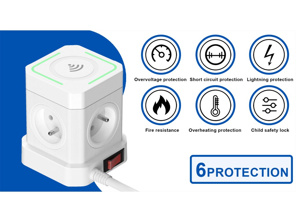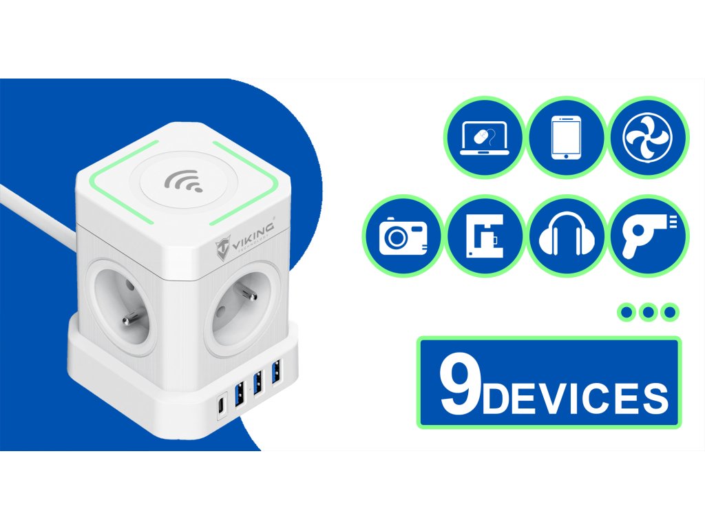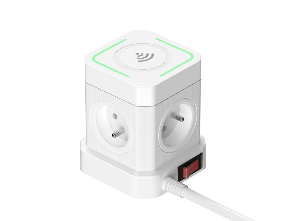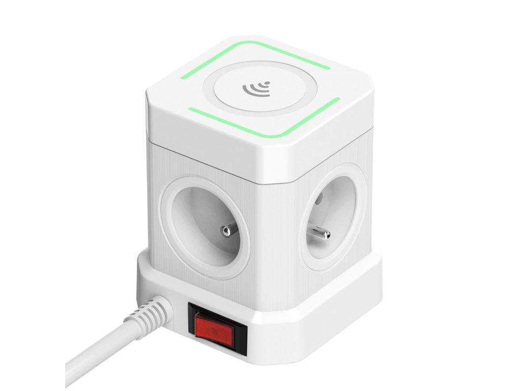 Síťový adaptér • rozbočovač • zásuvka • 4 x AC výstup (230V) • 3 x USB-A výstup 12W (5V/2.4A) • 1x USB-C výstup 20W(5V/3A, 9V/2.22A, 12V/1.67A) • bezdrátové nabíjení (15W) • kompaktní rozměry • délka kabelu 2 m • kvádrový design • tlačítko ON/OFF • možnost nabíjení až 9 zařízení současně
