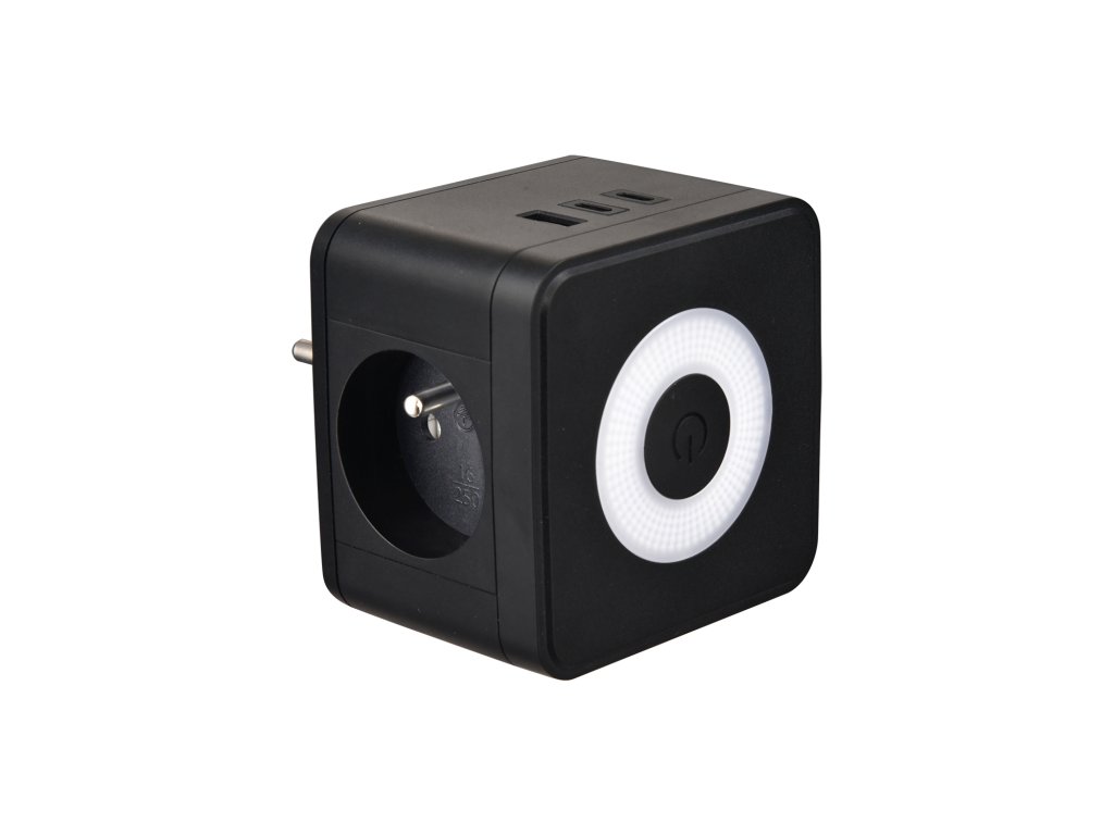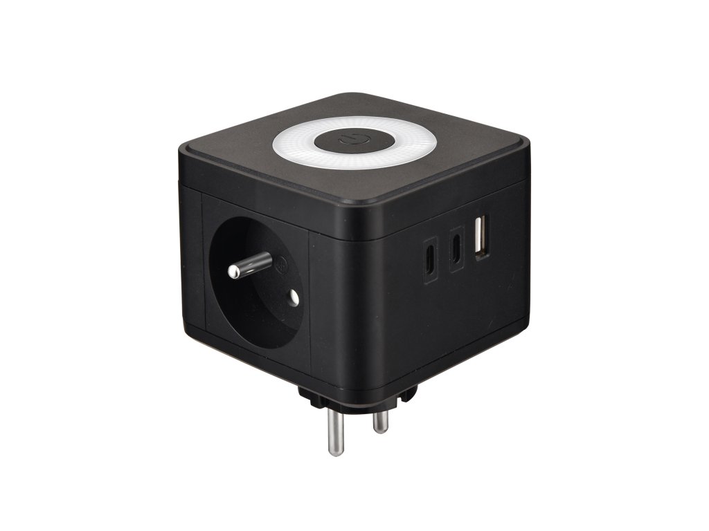Síťový adaptér • zásuvka • rozbočovač • 2 x AC výstup (230V/16A) • 1 x USB-A výstup 18W (5V/3A, 9V/2A, 12V/1.5A) • 2 x USB-C výstup 20W (5V/3A, 9V/2.22A, 12V/1.67A) • 17W (5V/3A) pro USB-A + USB-C + USB-C • dotykové světlo se třemi intenzitami svícení • kompaktní rozměry a design • možnost nabíjení až 5 zařízení současně