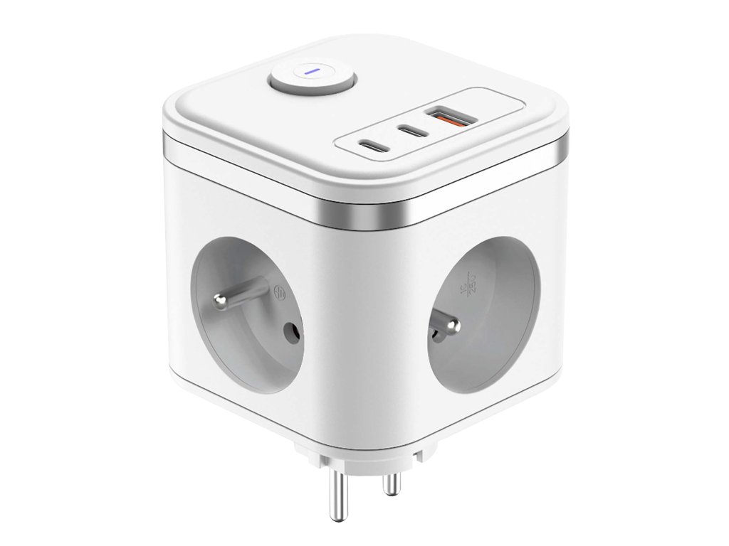 Síťový adaptér • zásuvka • rozbočovač • 3 x AC výstup (230V) • 1 x USB-A výstup 18W (5V 3A, 9V 2A, 12V 1,5A) • 2 x USB-C výstup 20W (5V 3A, 9V 2,22A, 12V 1,67A) • kompaktní rozměry a design • tlačítko ON/OFF • možnost nabíjení až 6 zařízení současně
