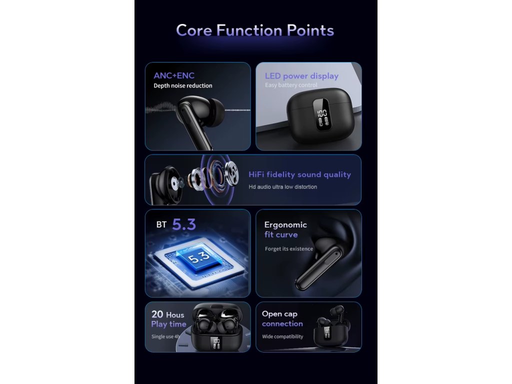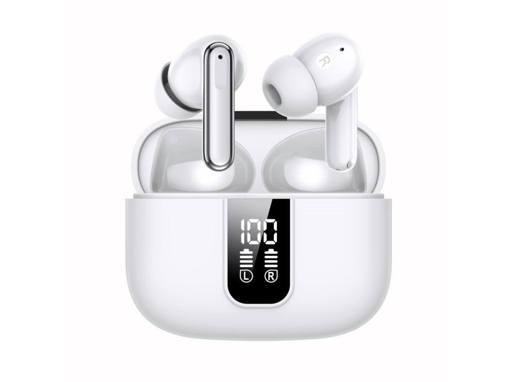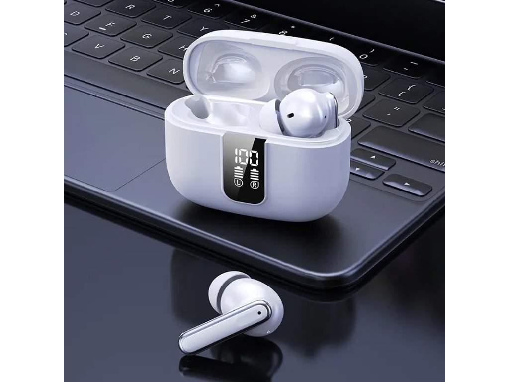 Sluchátka nabízejí pokročilou hybridní technologii potlačení hluku, která zajišťuje křišťálově čistý zvuk. Tato technologie účinně redukuje rušivé zvuky z okolí, což vám umožní plně se soustředit na hudbu nebo hovory, i když se nacházíte v hlučném prostředí. Bez ohledu na to, zda dojíždíte, pracujete, nebo relaxujete doma, si můžete užívat nerušený poslech. Duální mikrofon ENC (Environmental Noise Cancellation) zlepšuje kvalitu hovorů tím, že potlačuje okolní zvuky a zajišťuje, že váš hlas bude jasně slyšet. S výdrží až 5 hodin na jedno nabití vám sluchátka umožní dlouhé hodiny poslechu. Nabíjecí pouzdro, které obsahuje dalších 400 mAh energie, prodlužuje celkovou dobu přehrávání. Díky pohotovostní době 150 hodin jsou sluchátka vždy připravena k použití. Pouzdro je navíc vybaveno digitálním displejem, který usnadňuje sledování stavu baterie. Sluchátka mají ergonomický design, který zajišťuje pohodlné nošení po celý den a bezpečně sedí v uších. Matný povrch dodává elegantní a stylový vzhled, zatímco lehká konstrukce z ABS zajišťuje komfort. Integrované dotykové ovládací prvky umožňují snadno ovládat přehrávání hudby, přijímat hovory a aktivovat hlasové asistenty pouhým dotykem.