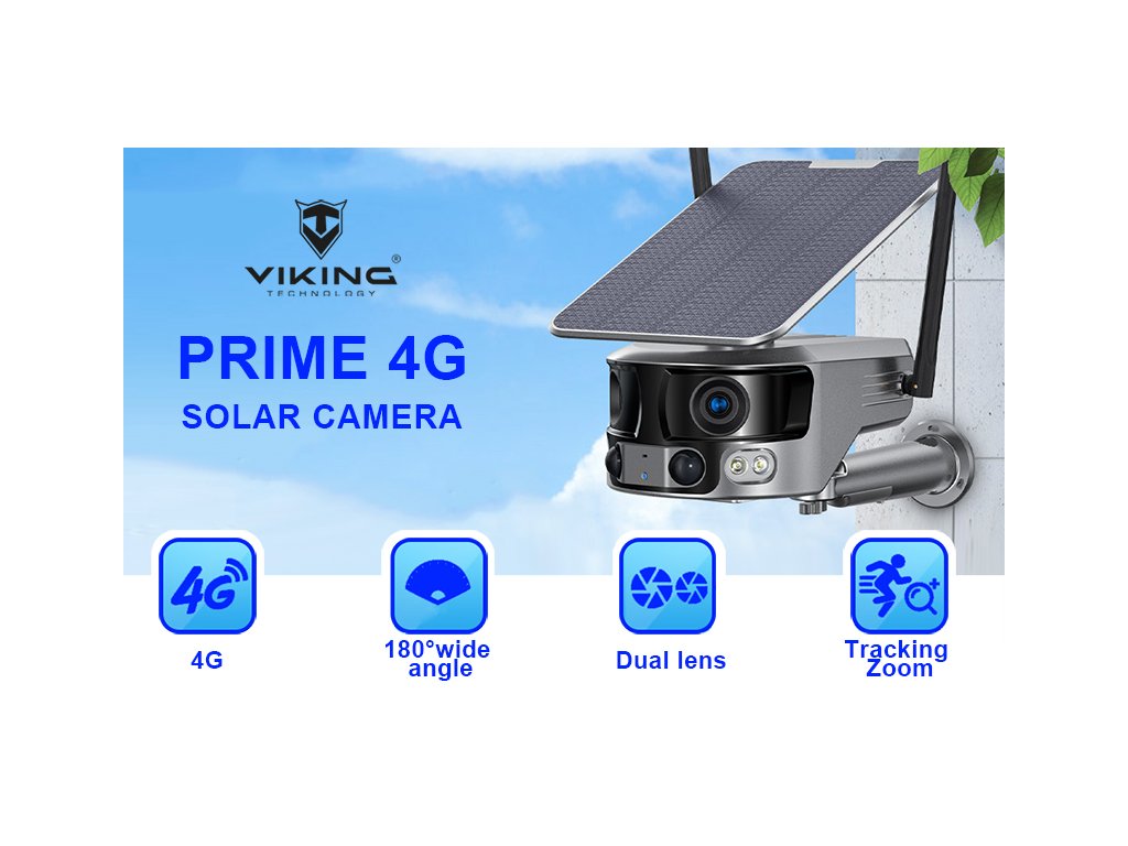 Solární 4K kamera Viking PRIME 4G, která disponuje panoramatickými čočkami s 180° úhlem pohledu, IP66 ochranou (platí pouze v případě, že jsou všechny vstupní i výstupní konektory zakryté např. silikonovým ochranným krytem), PIR čidlem - dosah 8m, detekcí lidského pohybu a nočním viděním. Ke kameře je také možno připojit výkonný solární panel, díky kterému je kamera nezávislá na elektrické síti.
