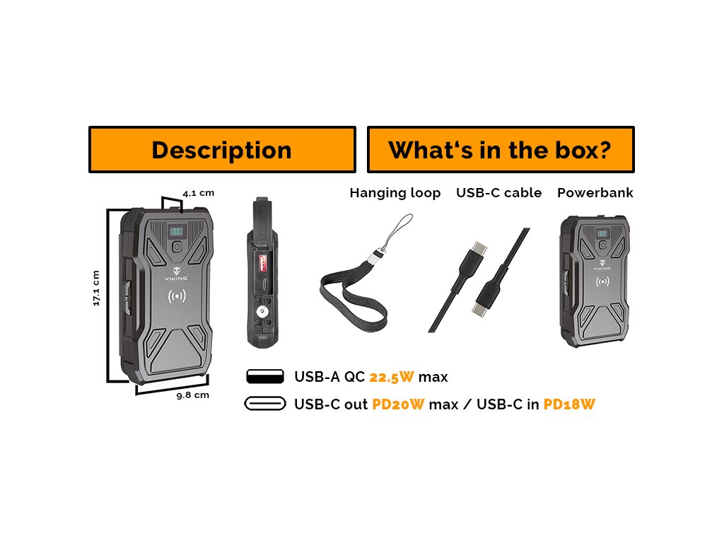 Viking TYR I je vybaven moderními technologiemi nabíjení. Pomocí výstupů USB-C a USB-A můžete svá zařízení nabíjet rychlostí až 22.5W, a to díky podpoře protokolů pro rychlé nabíjení QC a PD. Už nikdy nebudete čekat na to, až se vaše zařízení znovu nabije. Se vstupem USB-C a podporou rychlého nabíjení PD 18W Max můžete rychle dobít i samotnou powerbanku.