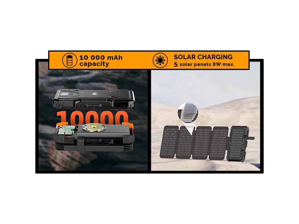 Kapacita 10000mAh (37Wh) • podpora rychlonabíjení QC3.0 a Power Delivery • USB-C vstup až PD18W • USB-C výstup (PD20W max.) • USB-A výstup (QC22.5W max.) • bezdrátové wireless nabíjení 15W max. • 5 solárních panelů 8W max • IP54 • LED svítilna