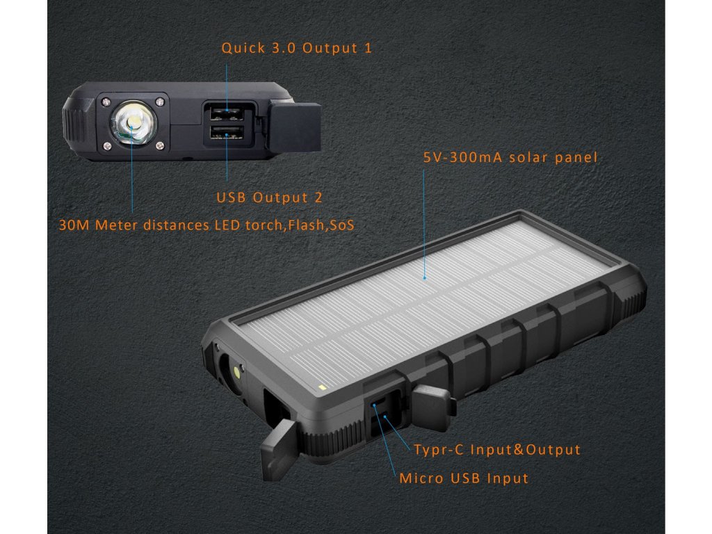 Nová solární powerbanka se zvýšenou odolností IP67 (platí pouze v případě, že jsou všechny vstupní i výstupní konektory zakryté např. silikonovým ochranným krytem), určena pro jakékoliv outdoorové aktivity, kde potřebujete odolnější a neomezený zdroj energie. Pomocí nového solárního panelu se špičkovým výkonem 300mA, můžete tuto powerbanku dobíjet kdykoliv.