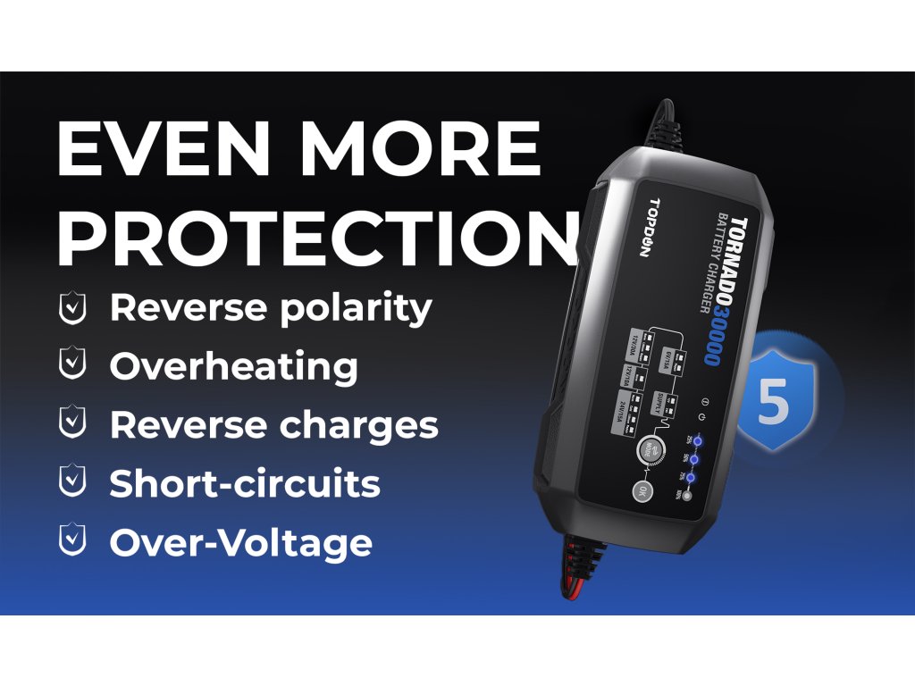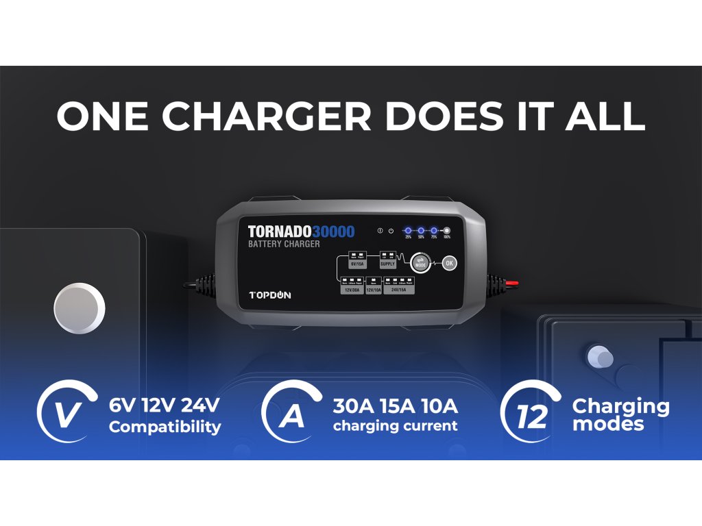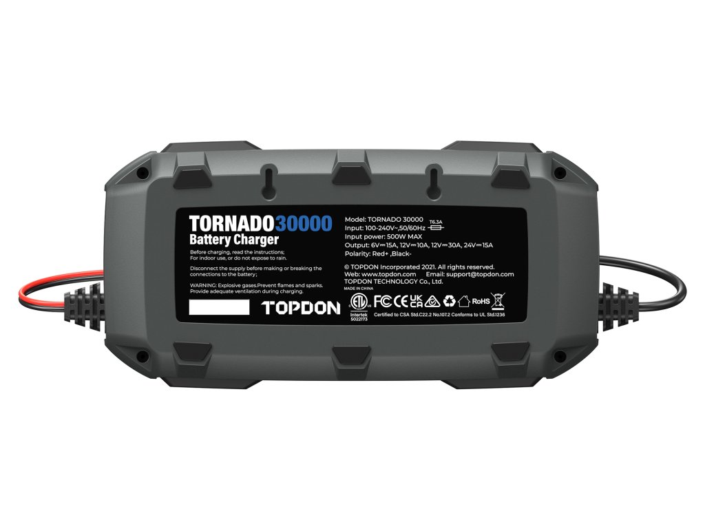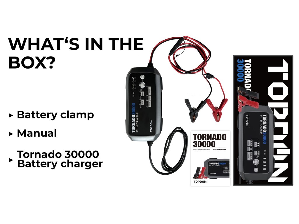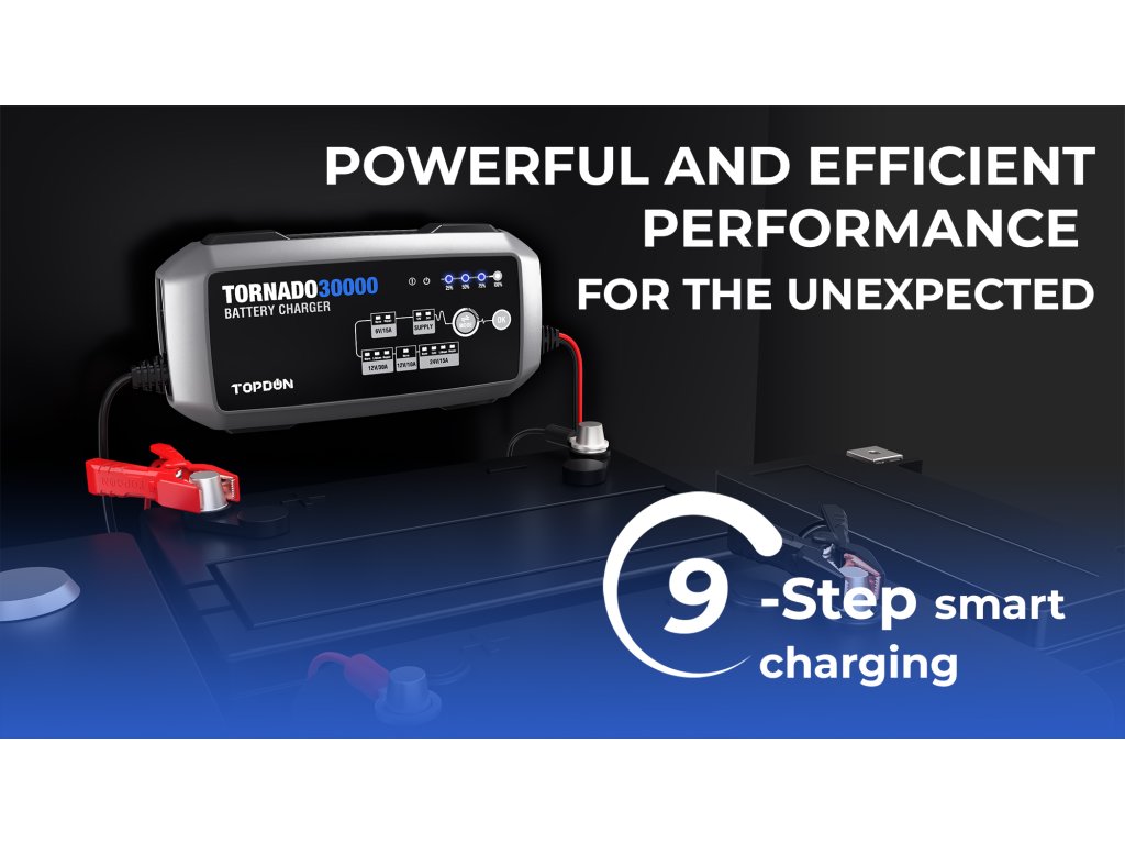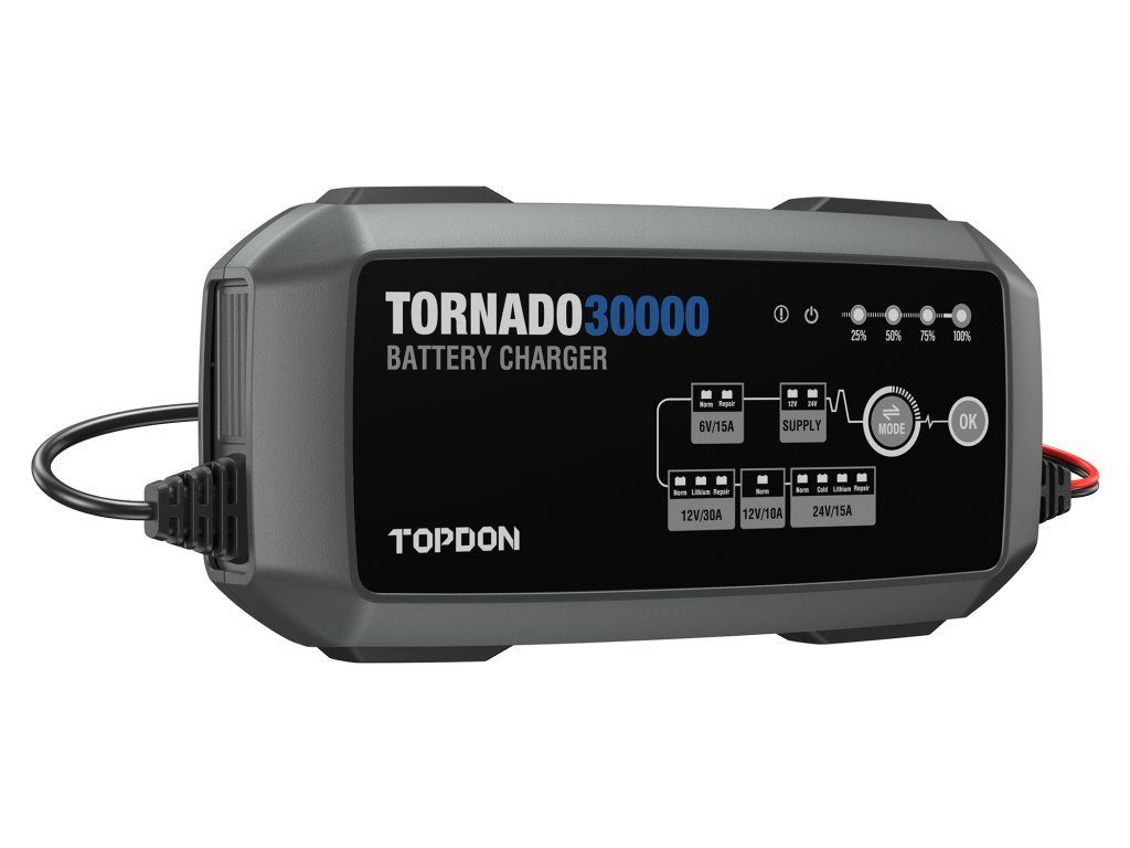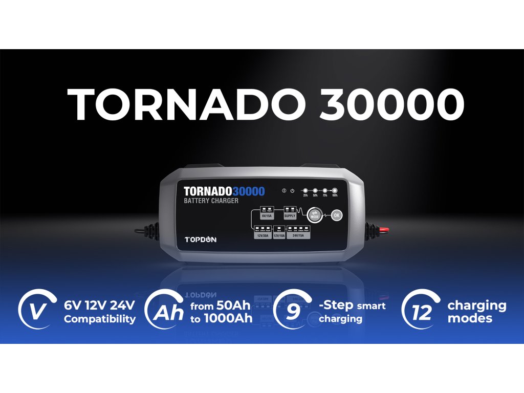 TORNADO 30000 dokáže automaticky detekovat sulfataci baterie a stratifikaci kyseliny a pomocí funkce pulzní opravy obnoví ztracený výkon baterie pro silnější startování motoru a prodloužení životnosti baterie.