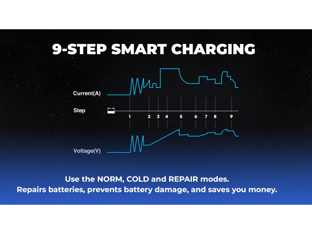 Jeho 9krokové inteligentní nabíjení poskytuje baterii silnou ochranu a systém automatického "nabíjení/odpojení" eliminuje riziko přebití. Pomocí režimů NORM, COLD a REPAIR můžete nabíjení baterii přizpůsobit, a prodloužit tak její životnost.
