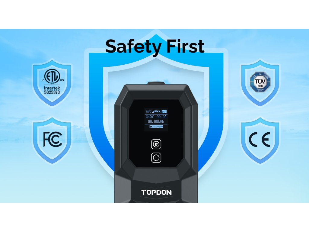 Bezpečnost je pro výrobce klíčovou prioritou. Nabíjecí kabel Topdon PulseQ AC Portable proto prošel přísným testováním a získal certifikace TUV a CE.
