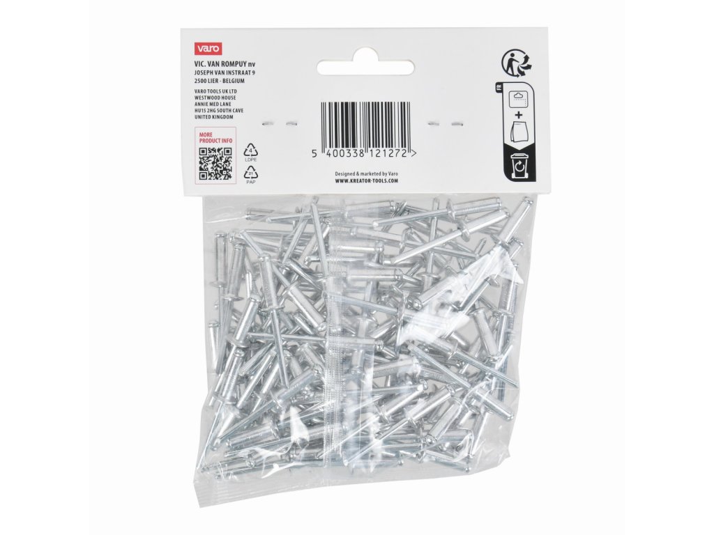 Trhací nýty 4,8x16mm 100ks. Tyto trhací nýty KRTH62706 z naší řady Kreator mají průměr 4,8 mm. Používejte je k rychlému a bezšroubovému spojení kovových, hliníkových nebo plastových předmětů o tloušťce až 12 mm. To se provádí pomocí nýtovacích kleští. Balení obsahuje 100ks., Průměr - 4,8 mm,...