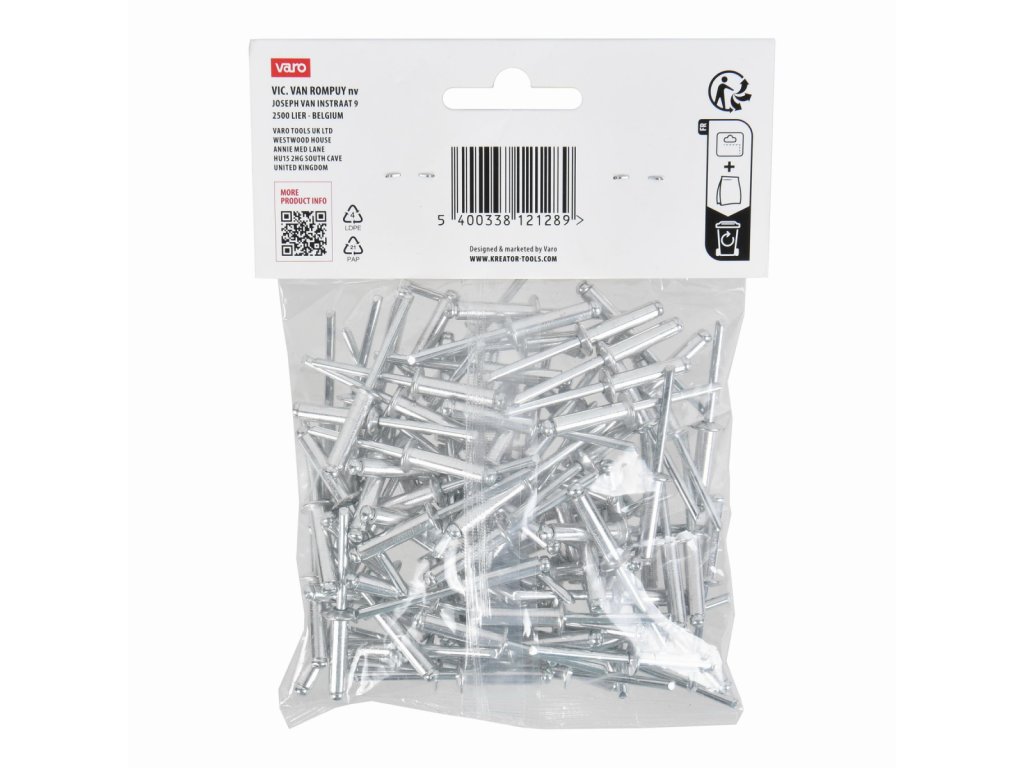 Trhací nýty 4,8x20mm 100ks. Tyto trhací nýty KRTH62707 z naší řady Kreator mají průměr 4,8 mm. Používejte je k rychlému a bezšroubovému spojení kovových, hliníkových nebo plastových předmětů o tloušťce až 16 mm. To se provádí pomocí nýtovacích kleští. Balení obsahuje 100ks., Průměr - 4,8 mm,...