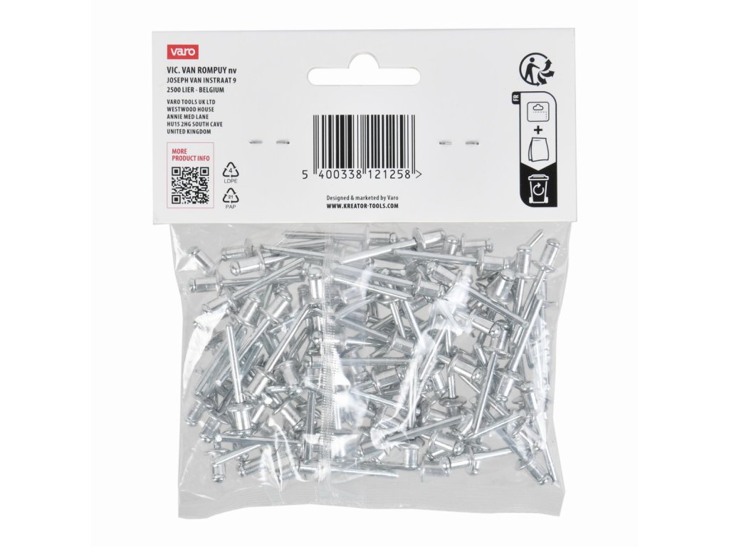 Trhací nýty 4,8x6,4mm 100ks. Tyto trhací nýty KRTH62704 z naší řady Kreator mají průměr 4,8 mm. Používejte je k rychlému a bezšroubovému spojení kovových, hliníkových nebo plastových předmětů o tloušťce až 3 mm. To se provádí pomocí nýtovacích kleští. Balení obsahuje 100ks., Průměr - 4,8 mm,...