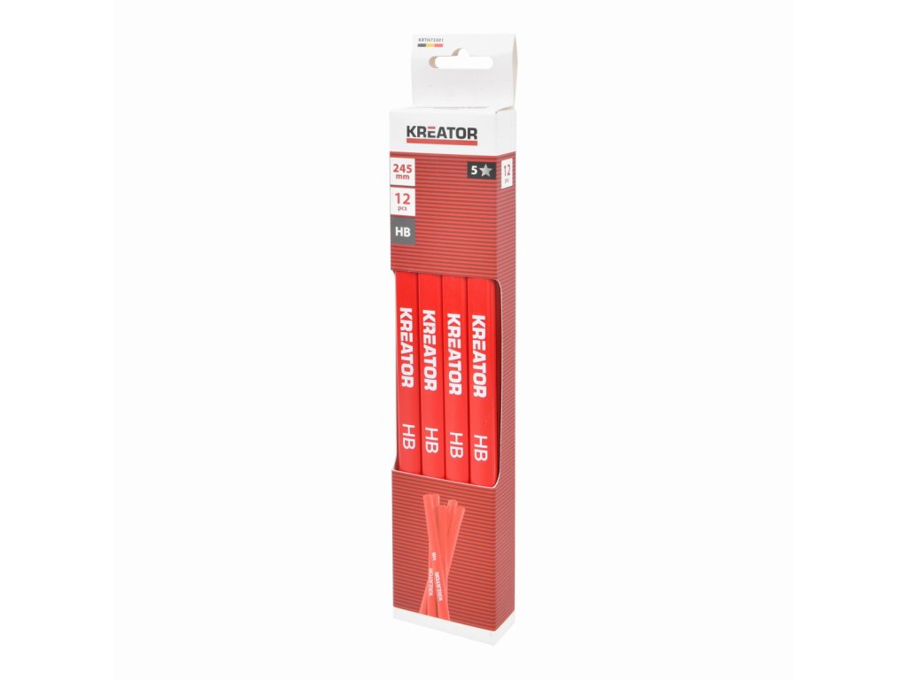 Tyto tužky KRTH73301 z naší řady Kreator jsou určeny pro práci se dřevem. Tesařská tužka slouží k výraznému a odolnému značení materiálů jako je dřevo (i mokré), beton, kov, karton a zdivo, a je proto nepostradatelná na stavbách a v dílnách. Její plochý oválný tvar brání kutálení a umožňuje kreslit silné i tenké čáry a snadno se brousí nebo ostrouhá nožem. Tato sada obsahuje 12 červených tužek o délce 245 mm.