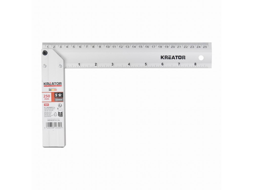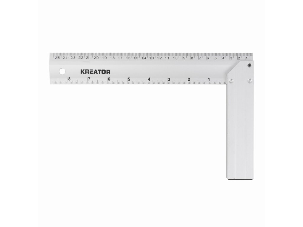 Úhelník 250mm ALU - HIGH QUALITY. Tento úhelník KRTH70501 od Kreator má délku 250 mm a je vyroben z pevného, ale lehkého hliníku. Lze jej použít k měření a značení úhlů 90st a 45st. Má stupnici v mm i palcích., Délka - 250 mm, Stupnice - v milimetrech a palcích, Hmotnost - 0,17 kg...