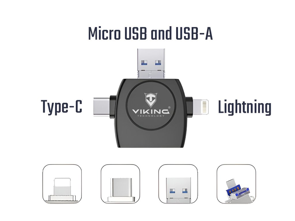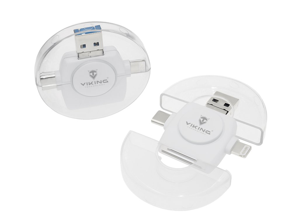 Viking čtečka paměťových karet V4 USB3.0 4v1 • 4 konektory: Lightning, Micro USB, USB-A 3.0, USB-C • Vhodný pro iOS, Android, Windows i Linux • Podpora většiny běžných formátů souborů • Rozšíření paměti telefonu, tabletu nebo notebooku • Malé, lehké zařízení s ochranným pouzdrem • hmotnost 10g