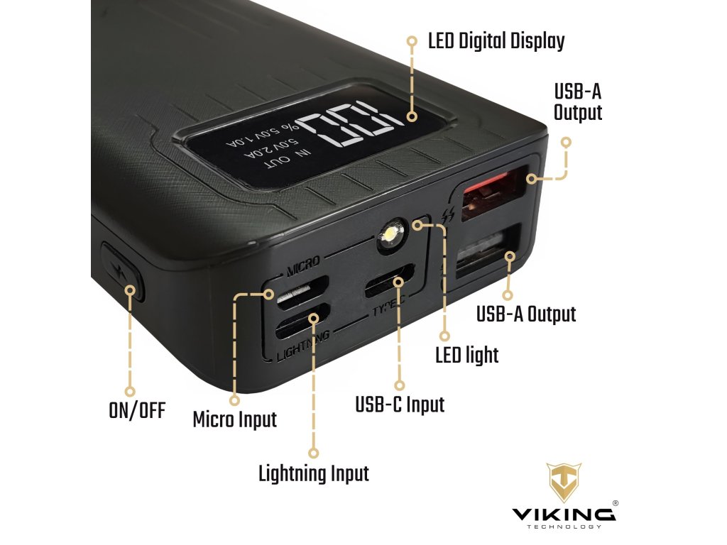 Powerbanka Viking go10 10000mAh • Kapacita: 10000mAh/37Wh • Maximální výkon: 15W • Vstupy a výstupy (USB-A, USB-C, Lightning, Micro USB) • LED display