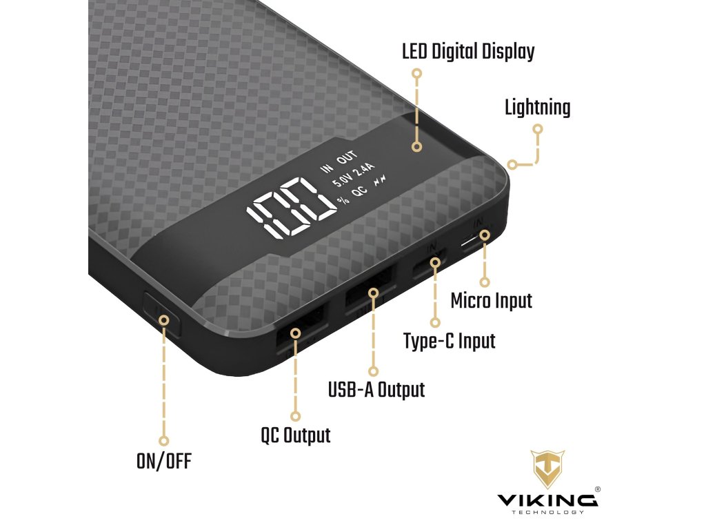 Powerbanka Viking PN-961PD 10000mAh • Kapacita: 10000mAh/37Wh • Maximální výkon: 18W • Rychlé nabíjení PD 3.0 a QC 3.0 • Široká škála vstupů a výstupů (USB-A, USB-C, Micro USB, Apple Lightning) • Vestavěný inteligentní čip (MCU) • LED display