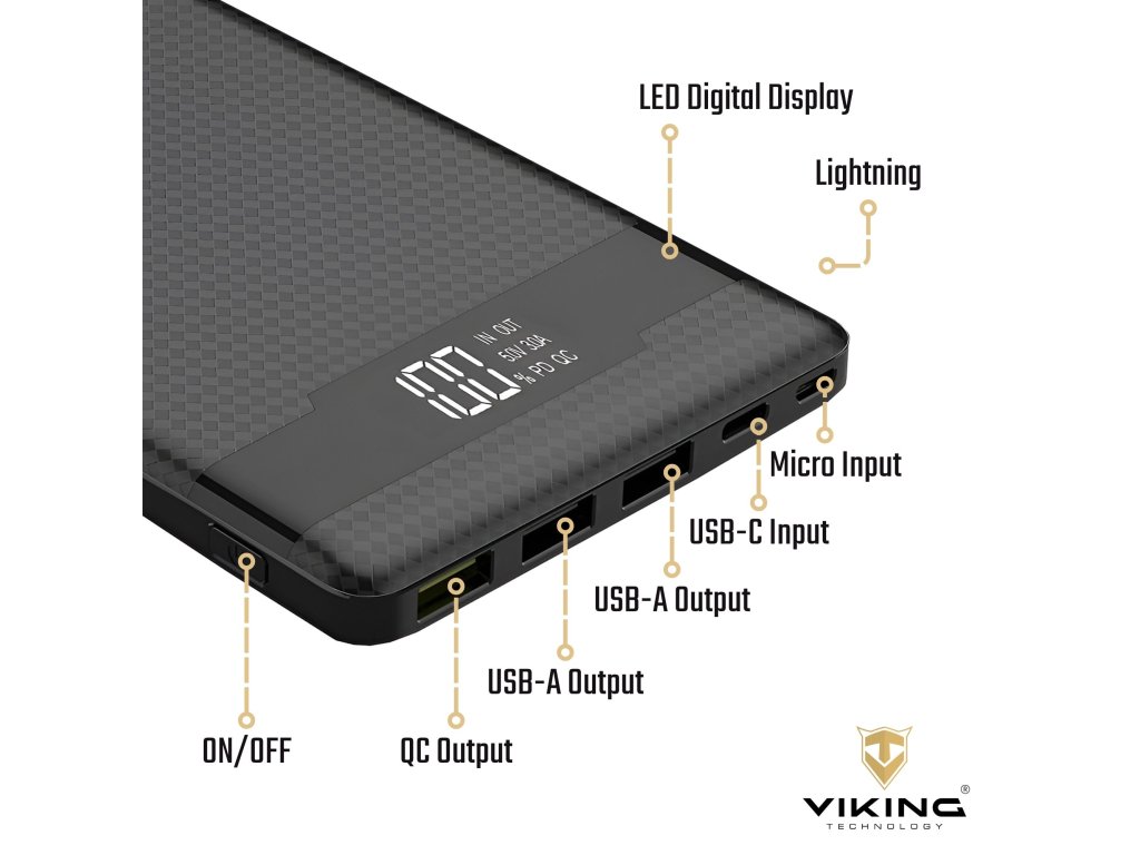 Powerbanka Viking PN-962PD 20000 mAh • Kapacita: 20000mAh/74Wh • Maximální výkon: 22,5W • Rychlé nabíjení PD 3.0 a QC 4.0+ • Široká škála vstupů a výstupů (USB-A, USB-C, Micro USB, Apple Lightning) • Vestavěný inteligentní čip (MCU) • LED display