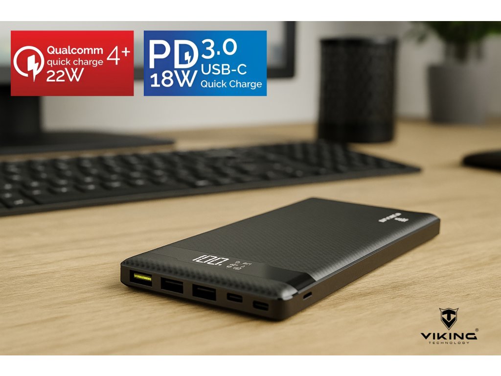 Powerbanka Viking PN-962PD 20000 mAh podporuje moderní technologie rychlého nabíjení PD 3.0 (Power Delivery) a QC 4.0+ (Quick Charge), díky kterým nabijete kompatibilní zařízení mnohem rychleji než běžnou nabíječkou – například mobil až na 50 % kapacity za krátkou dobu. Funguje jak s Androidem, tak s Apple zařízeními, pokud podporují rychlé nabíjení.