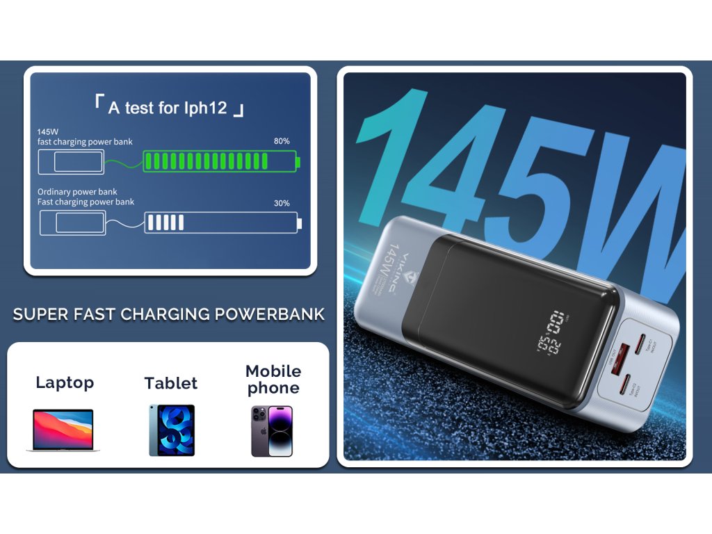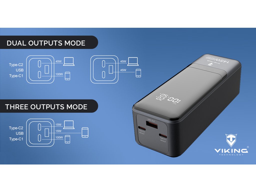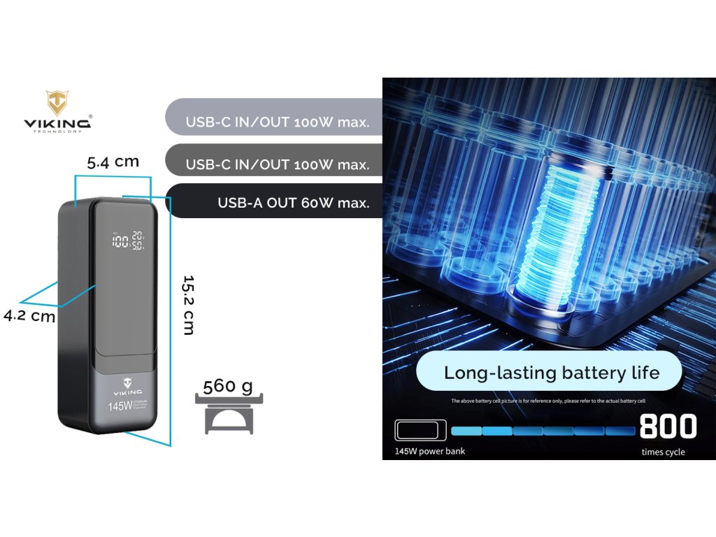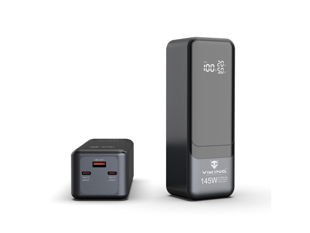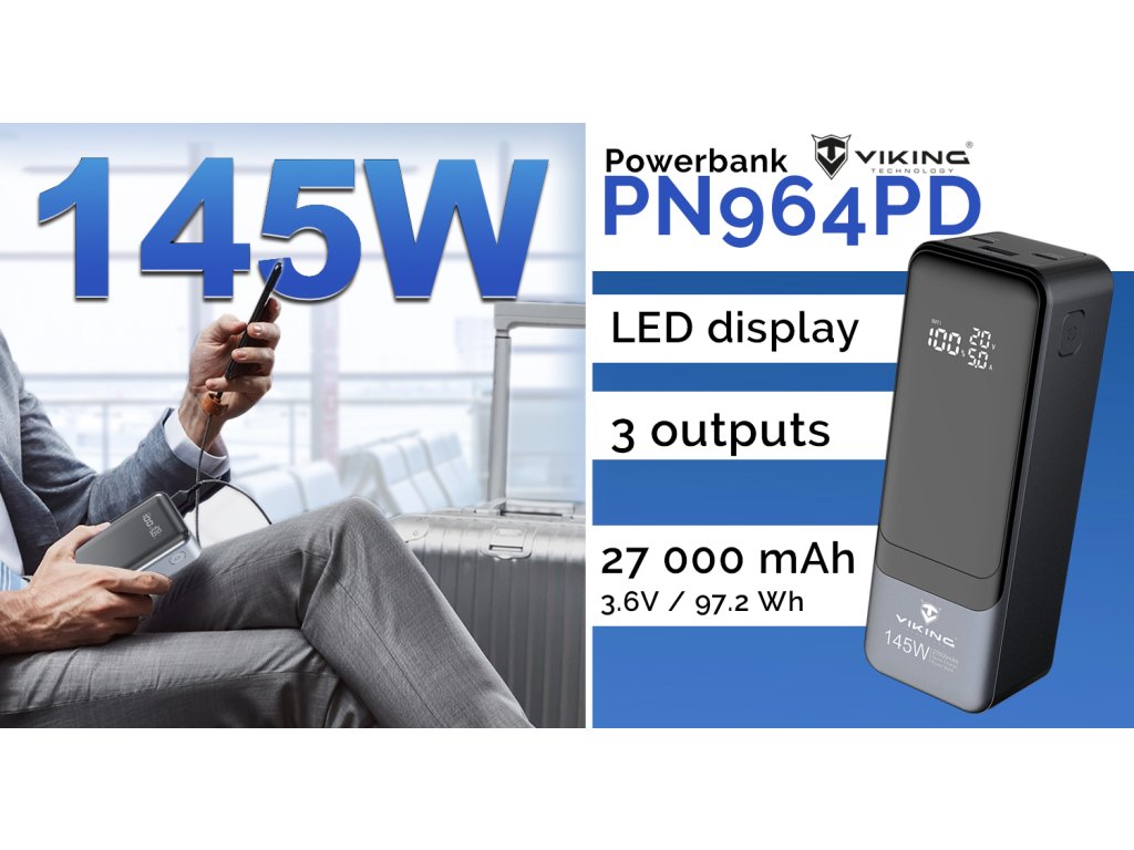 Powerbanka Viking PN-964PD 27000 mAh • Kapacita: 27000mAh/ 97.2Wh • Maximální výkon: 145W • Rychlé nabíjení PD a QC • Vstupy a výstupy (USB-A, USB-C) • Vestavěný inteligentní čip (MCU) • Funkce Pass-Through • LED display • Nabíjení notebooku