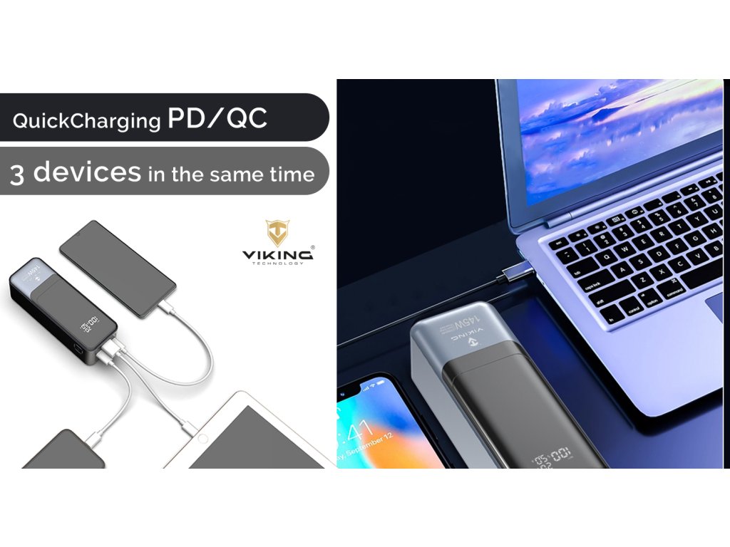 Powerbanka Viking PN-964PD 27000mAh podporuje moderní technologie rychlého nabíjení PD (Power Delivery) a QC (Quick Charge), díky kterým nabijete kompatibilní zařízení mnohem rychleji než běžnou nabíječkou – například mobil až na 50 % kapacity za krátkou dobu. Funguje jak s Androidem, tak s Apple zařízeními, pokud podporují rychlé nabíjení.