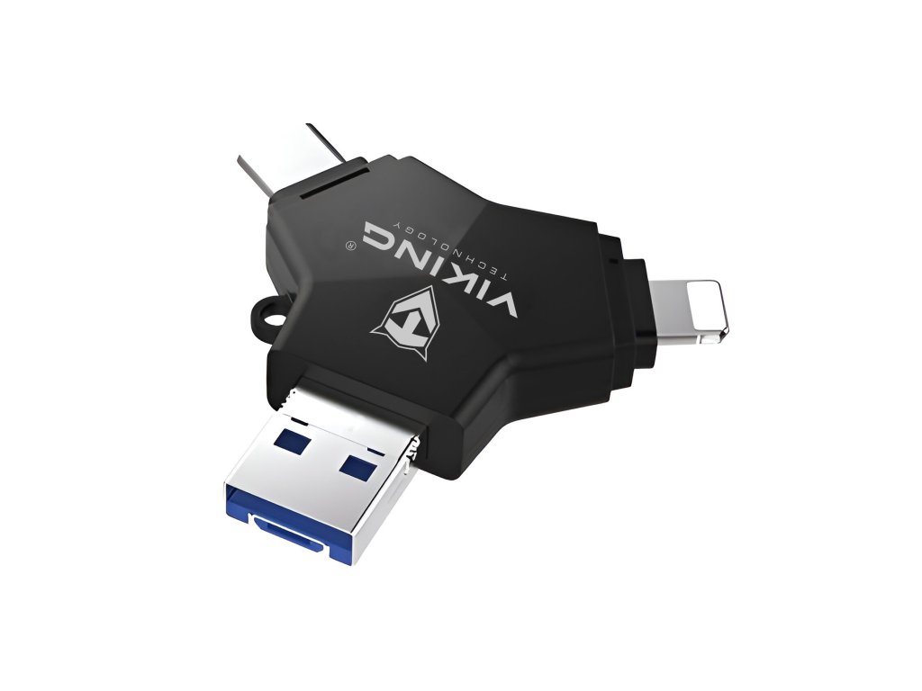Viking USB flash disk 3.0 • 4 konektory: USB-A, USB-C, Micro USB, Lightning • Tři varianty: 32 GB, 64 GB nebo 128 GB • rychlost až 100 MB/s • podpora FAT32 a exFAT • vhodný pro iOS, Android, PC i Mac • Kompaktní a lehké provedení • hmotnost 17,2 g