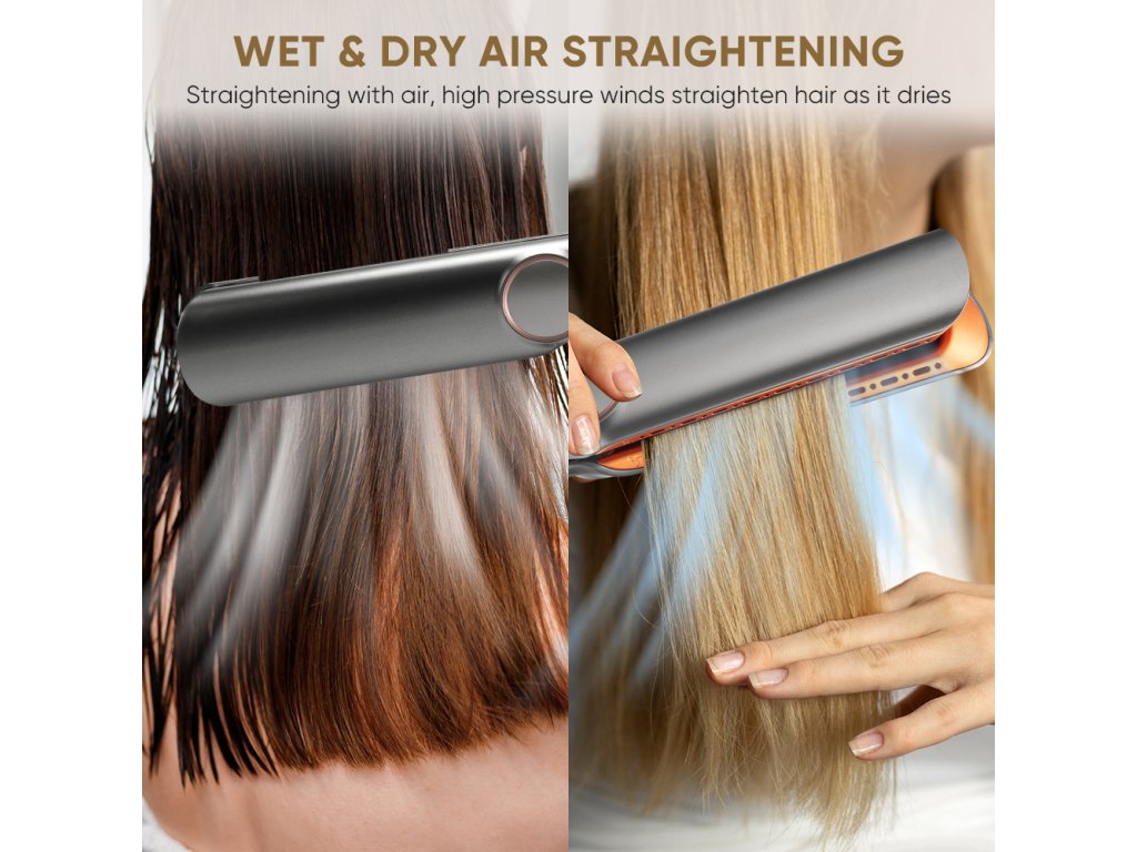 Vzduch je vyfukován dolů pod úhlem 45st, čímž se vytváří potřebné napětí pro narovnání vlasů a hladké zakončení účesu. Na rozdíl od běžných žehliček, které vlasy vysušují, tato žehlička zachovává přirozenou vlhkost vlasů, snižuje lámání a udržuje hydrataci od kořínků až po konečky.